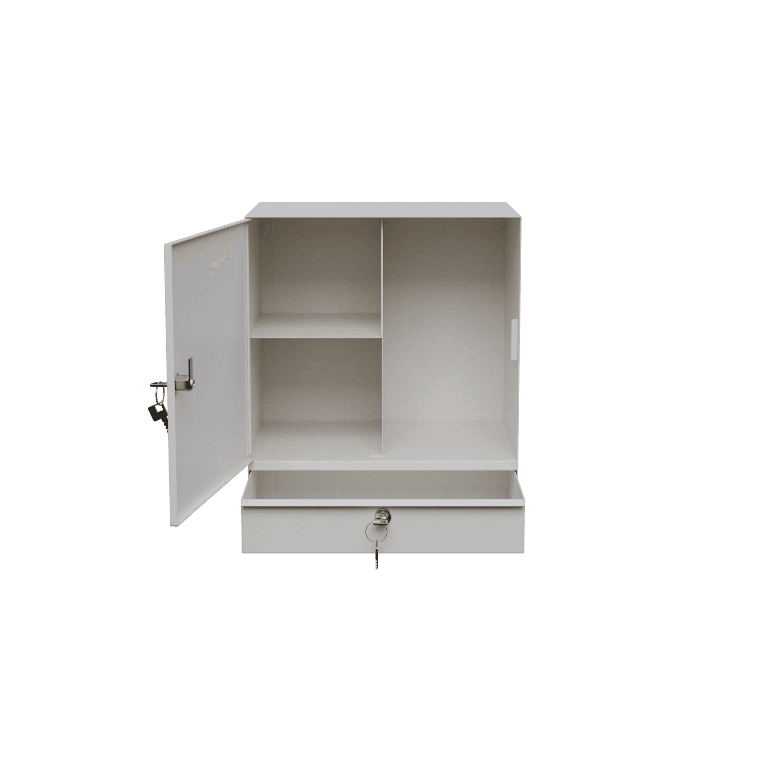 Praktiskt och säkert skåp för förvaring av läkemedel, anpassat för olika typer av boenden såsom äldreboenden, gruppboenden och vårdmiljöer. Skåpet är utrustat med tre separata fack samt en smidig utdragbar låda som ger god översikt och enkel åtkomst. Konstruktionen är framtagen för att underlätta en trygg och organiserad läkemedelshantering.